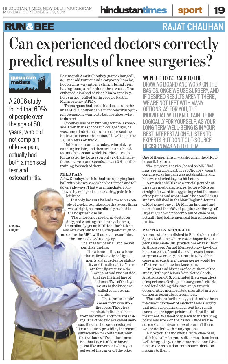 Last month Amrit Choubey (name changed), a 52 year old runner and a corporate honcho, hobbled his way into my clinic. He had been having knee pain for about three weeks. The orthopedician had advised him to get a key-hole surgery called Arthroscopic Partial Menisectomy (APM). The surgeon had based his decision on the knee MRI. Choubey came in for one final opinion because he wanted to be sure about what to do next.