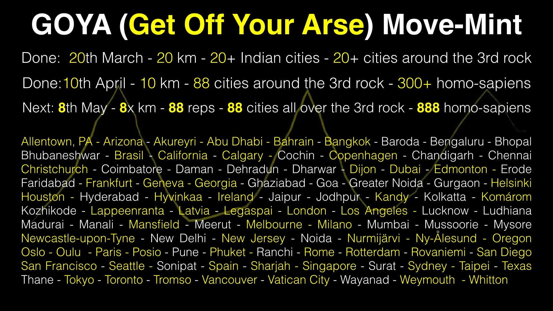 It started of as a random thought from a running buddy in US for making 20 people from 20 cities run 20 km on 20th March 2016. We managed to get 150+ people from 20+ Indian cities and 20+ cities from around the world to run 20k on 20th March.